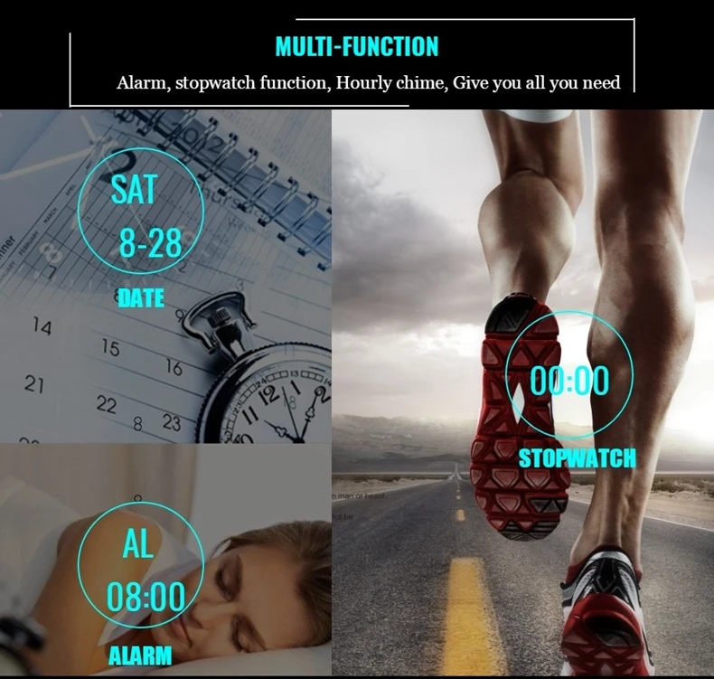 Feature: Stop Watch,Back Light,Led Display,Auto Date,Chronograph,Multiple Time Zone,Water-Resistance,Alarm,swim,Week Display