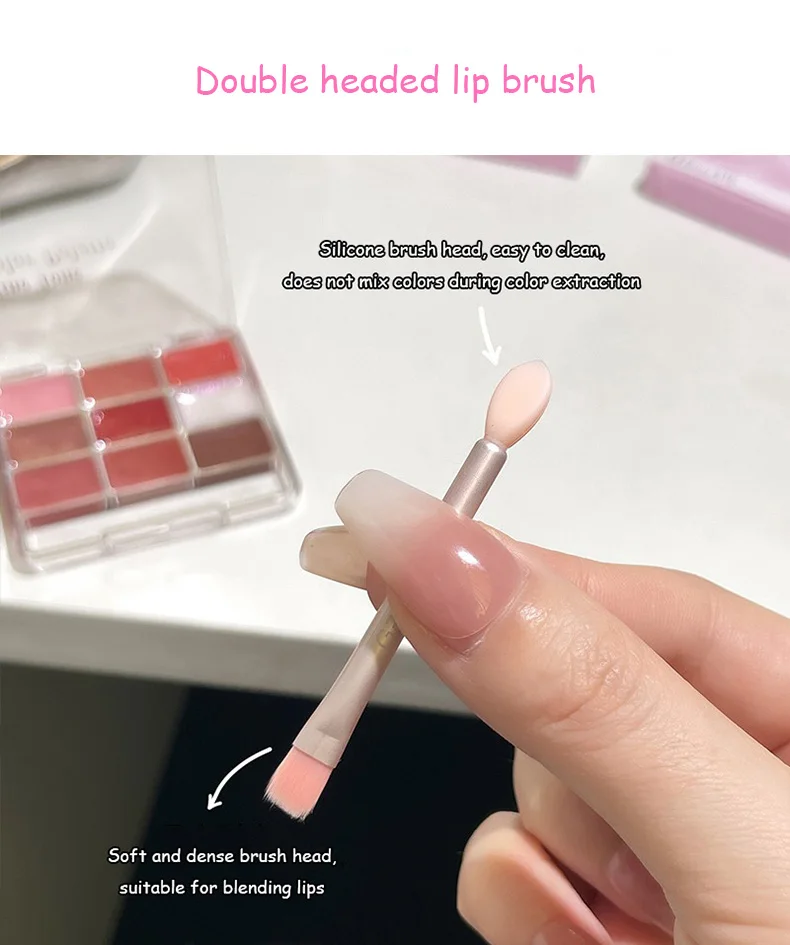 Double ended lip brush: One end is a silicone brush head, which is easy to clean and does not mix colors; The other end is a soft and dense brush head, suitable for blending lips.