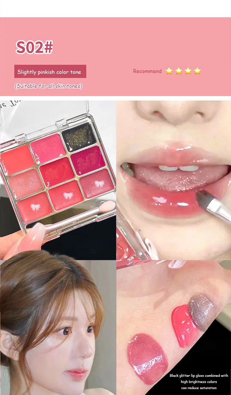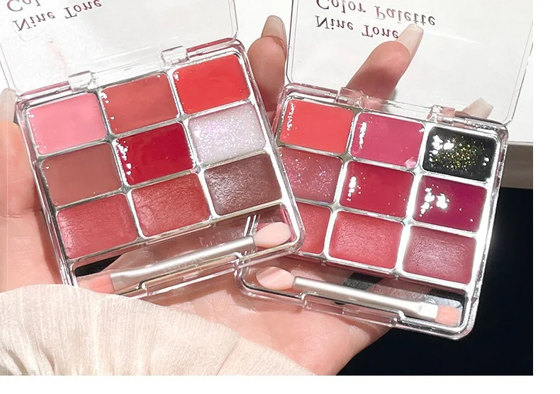 A plate of 9-color dual tone matte and crystal frozen lip gloss.