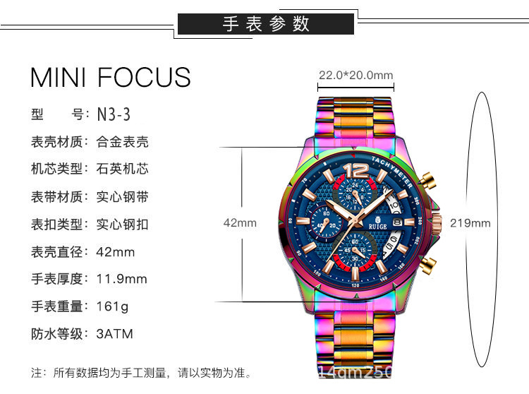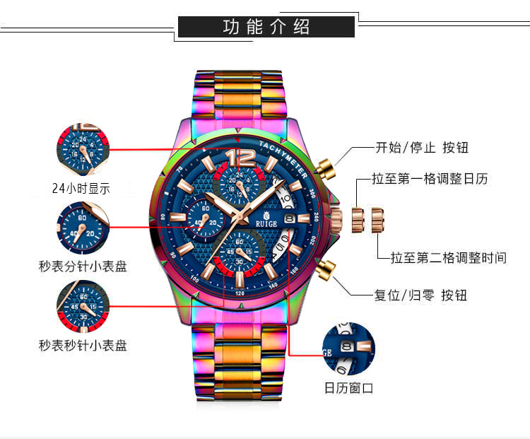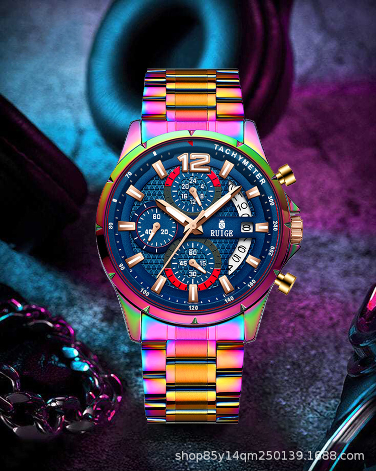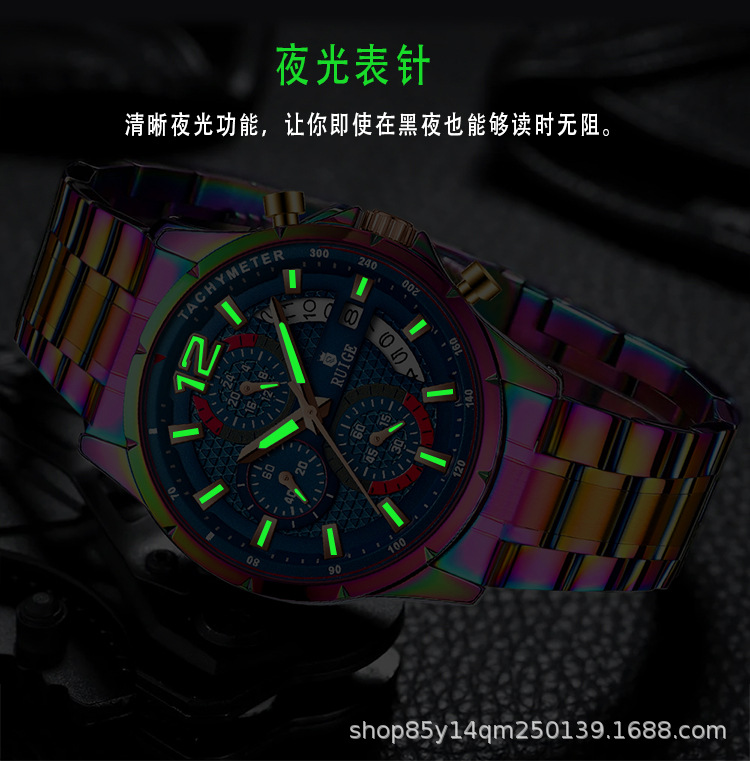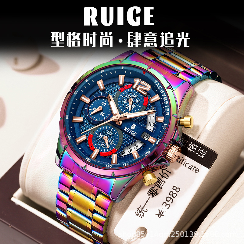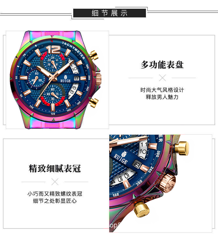 Stainless Steel Case : The watch features a durable stainless steel case, offering both strength and elegance. Cross-border Appeal : Its unique magic case design appeals to a global audience, transcending borders and cultures. Chinese Origin : Crafted in China, this watch represents a blend of traditional craftsmanship and modern design. Quartz Movement : Equipped with a precise quartz movement, this RUIGE watch ensures accurate timekeeping for daily use. Multifunctional Design : This multifunctional watch combines style with practicality, making it suitable for various occasions.
