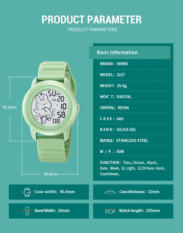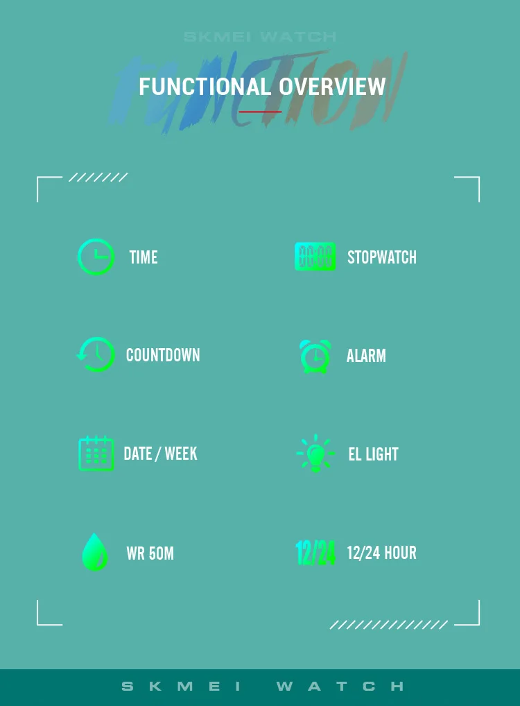 ▪ Function: Time, Chronograph, Alarm clock, Week, Date, 12/24 hour format, 5 bar Waterproof, Shockproof, Stopwatch, Countdown,Led light