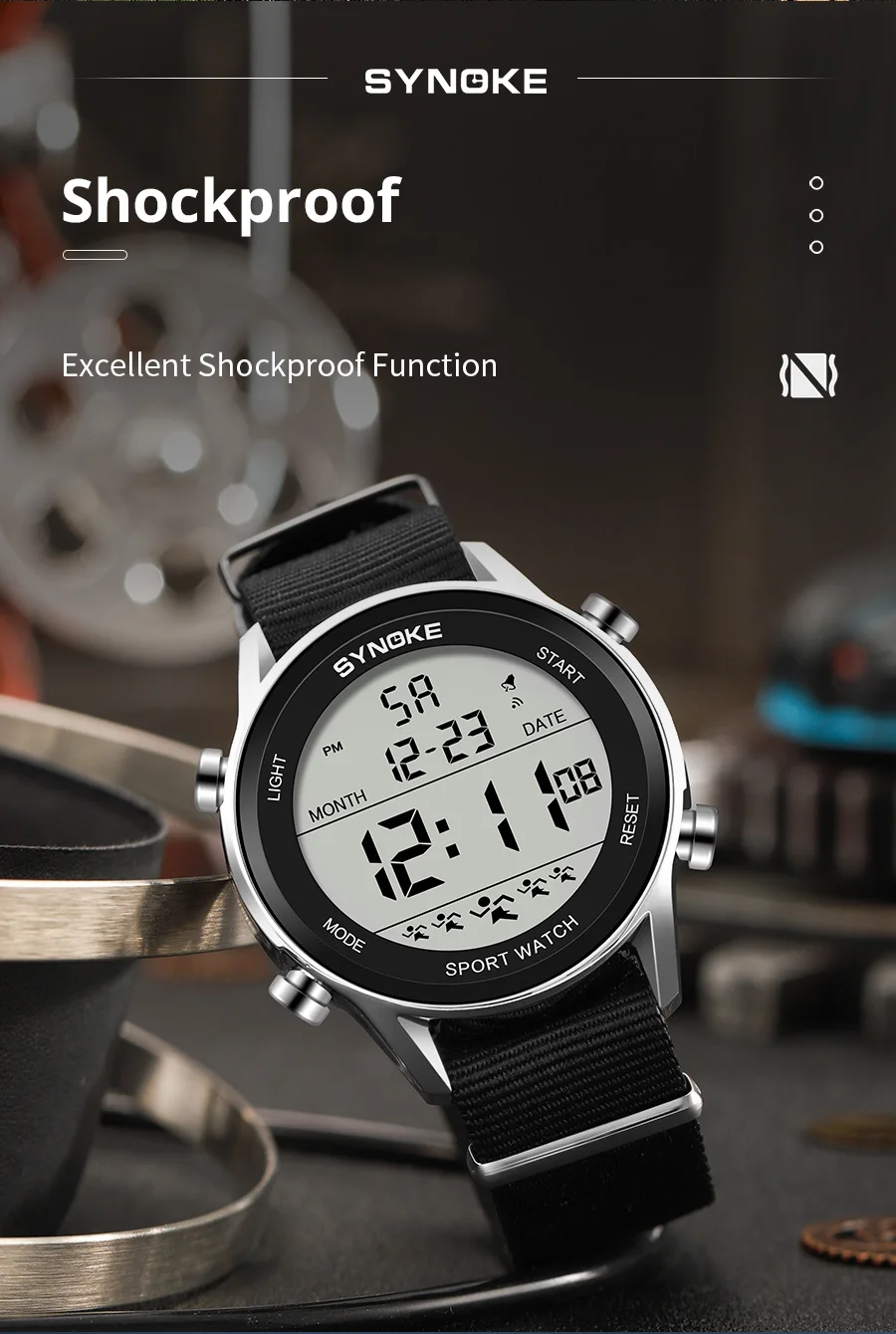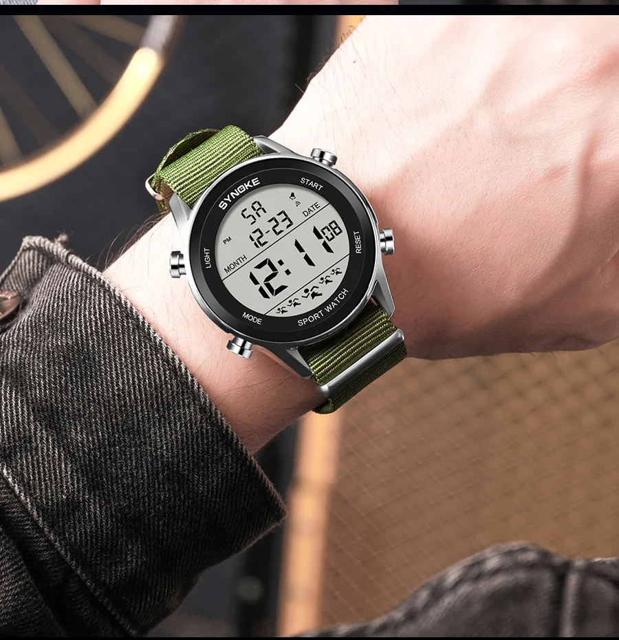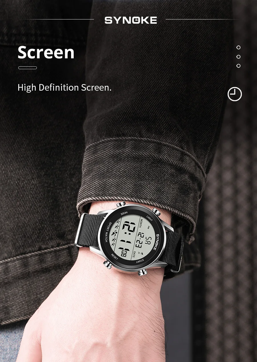 Synoke Men Outdoor Sports multifunctional waterproof large screen display luminous led digital for men nylon strap watch