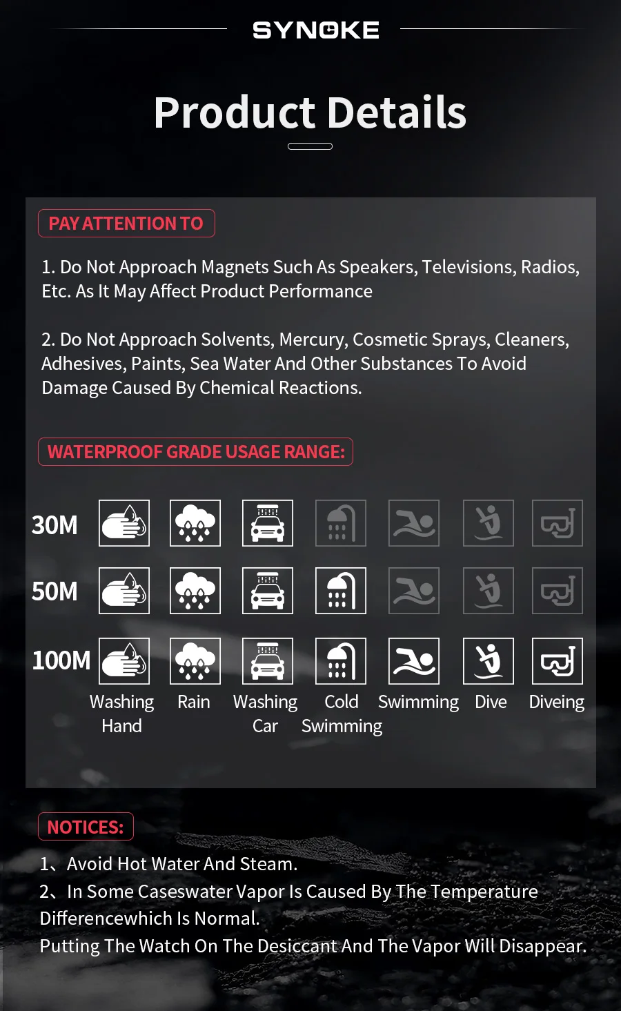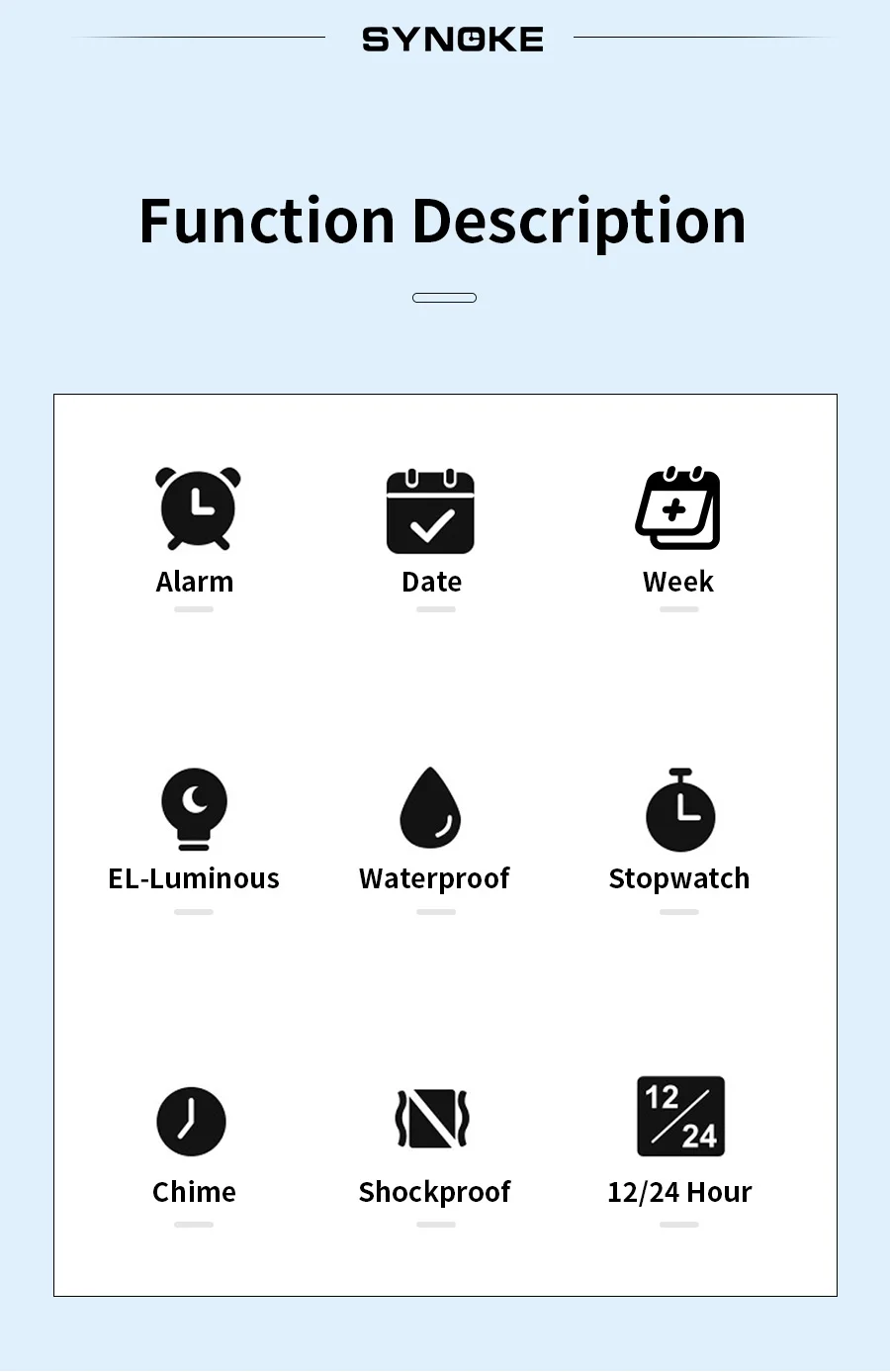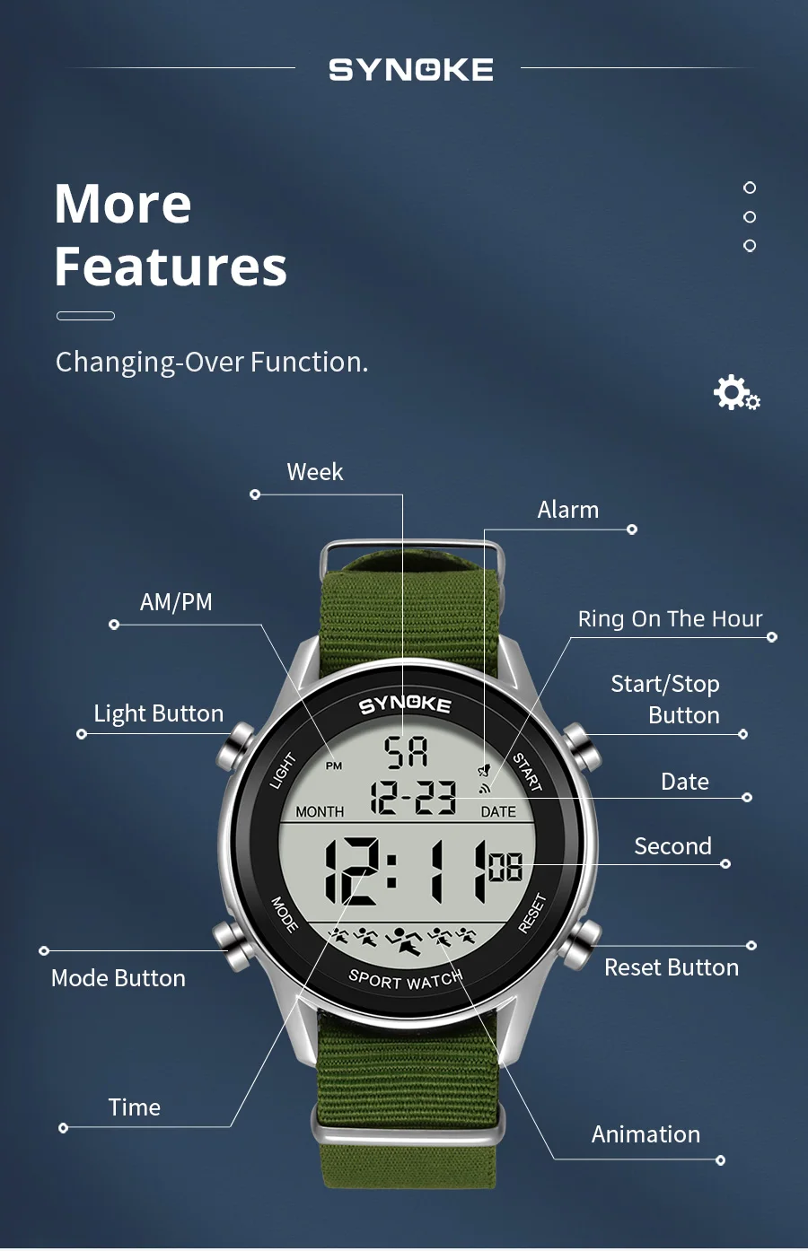 • Multifunctional Waterproof Watch :The Synoke Men's Outdoor Sports Watch is a multifunctional waterproof device, perfect for outdoor activities and sports. Its water resistance depth of 5Bar ensures it can withstand various water conditions.